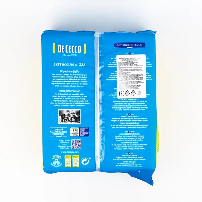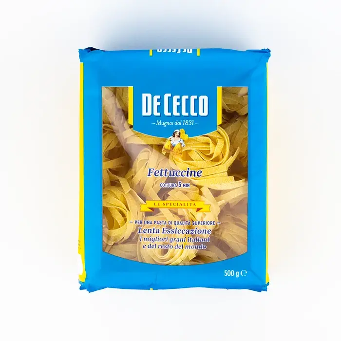 Феттучине — классический формат пасты в виде длинных, плоских и достаточно широких лент. Паста производится из отборной пшеницы твердых сортов и чистой воды. Феттучине имеет шероховатую и пористую текстуру, что помогает впитывать и удерживать в себе соус. Паста имеет пшеничный вкус с легким ореховым оттенком.