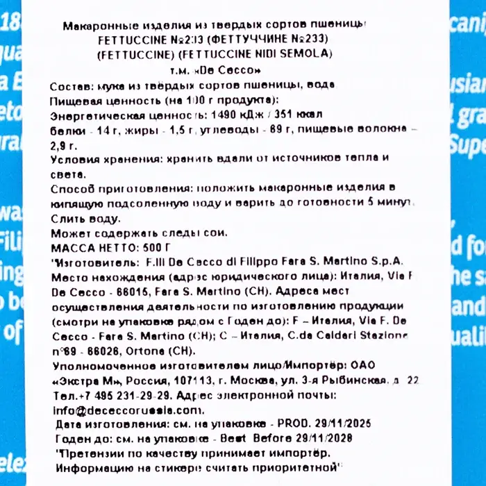 Макароны n. 233 Феттучине De Cecco, 500 г