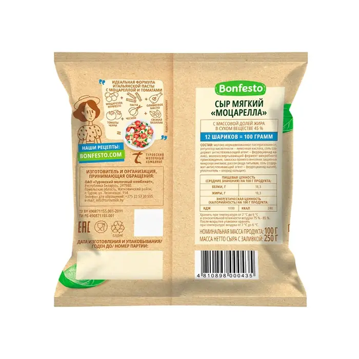 Моцарелла с нежным сливочным соленым вкусом имеет глянцевую и блестящую структуру, а внутри — плотную и слегка пористую. Сыр раскрывает свои вкусовые качества под воздействием температуры, равномерно плавится при запекании и хорошо тянется.