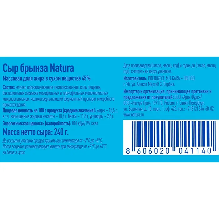 Сыр брынза жир. 45% "Natura", 240 г