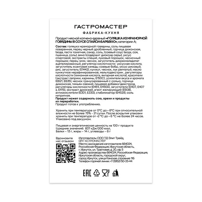 Голяшка мраморной говядины, соль пищевая поваренная, перец черный дробленный, горчица дижонская, (вода, паста томатная, сахар, соль, (соевый соус (вода, соя, пшеница, соль), вино (содержит диоксид серы), уксус спиртовой, экстракты специй, луковый порошок, чесночный порошок; перец чили, чеснок, загуститель дикрахмаладипат ацетилированный, регулятор кислотности - уксусная кислота, загуститель ксантановая камедь; соевые бобы, уксус рисовый, рис, загуститель (Е1442), кунжут, чеснок, лук репчатый, масло кунжутное нерафинированное, мальтодекстрин, регуляторы кислотности (лимонная кислота, янтарная кислота), красители (экстракт паприки, кармины, Е150С), усилители вкуса и аромата (Е621, Е635), чеснок гранулированный с солью, горчица дижонская, тимьян свежий, пищевая добавка (декстроза, регуляторы кислотности (Е451i, Е450iii), загустители (Е407, Е407а, Е415), экстракт дрожжей, агент желирующий (Е508), антиокислители (Е301, Е330), стабилизатор (Е452i)), соль нитритная.