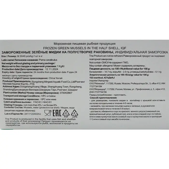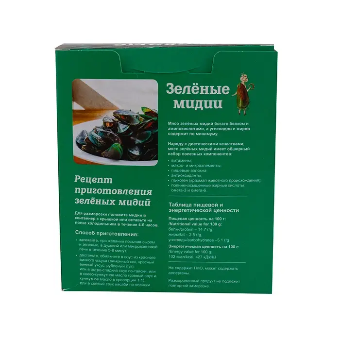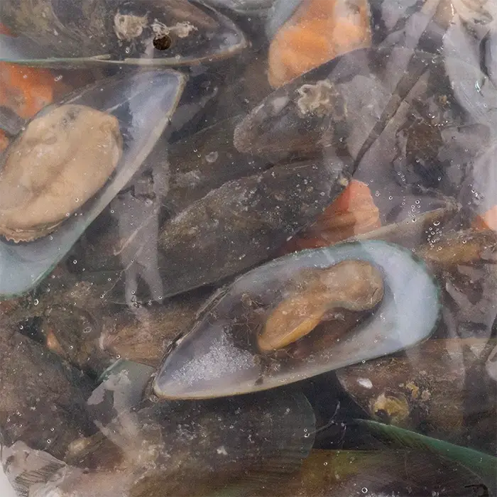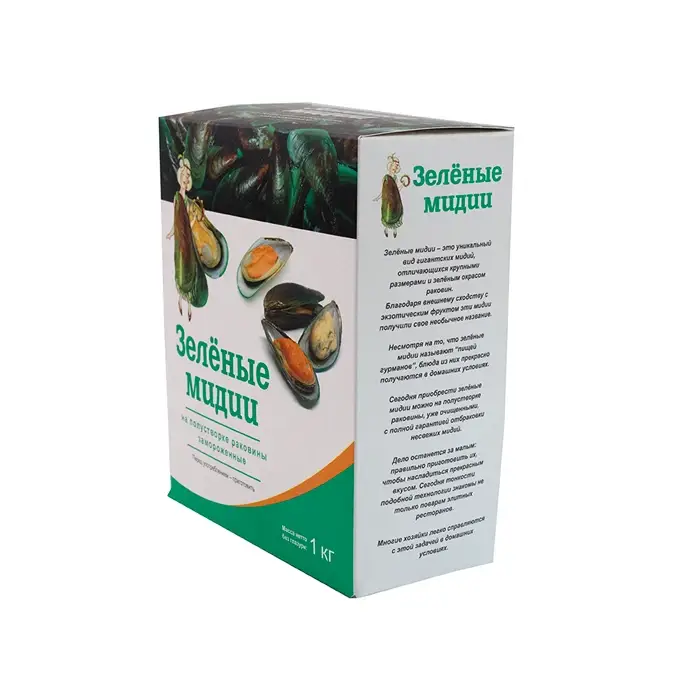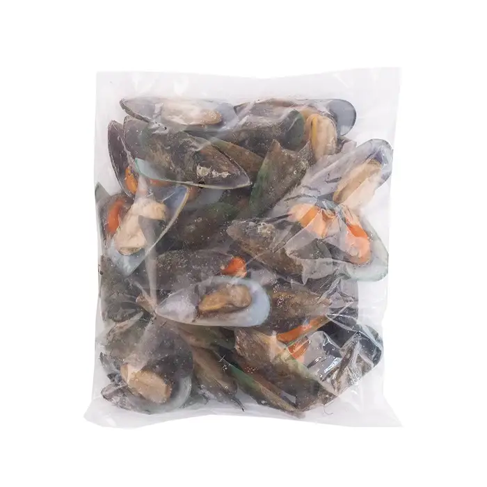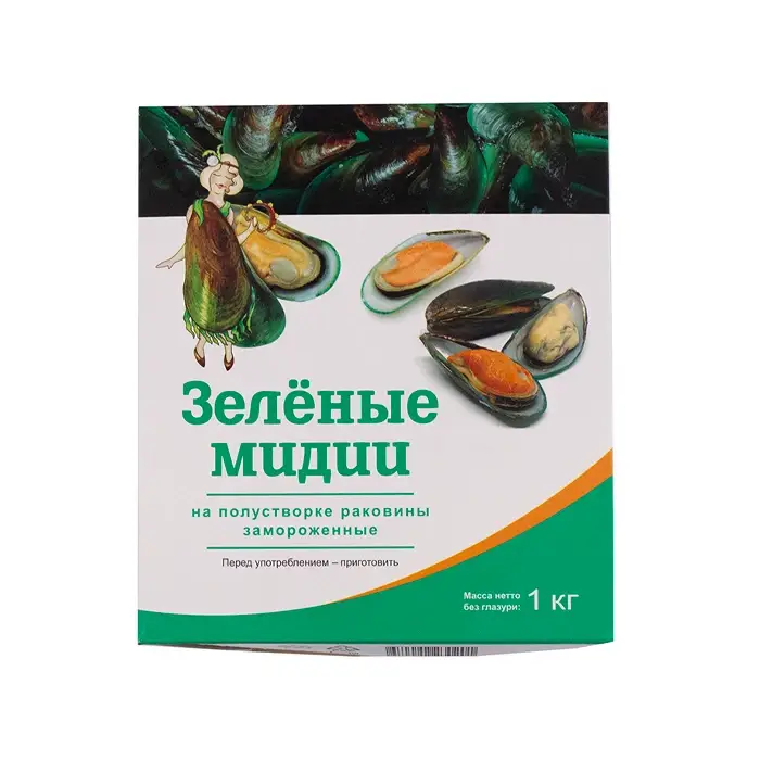 Мидии на половине раковины варено-мороженые 30/45 зеленые, 1 кг