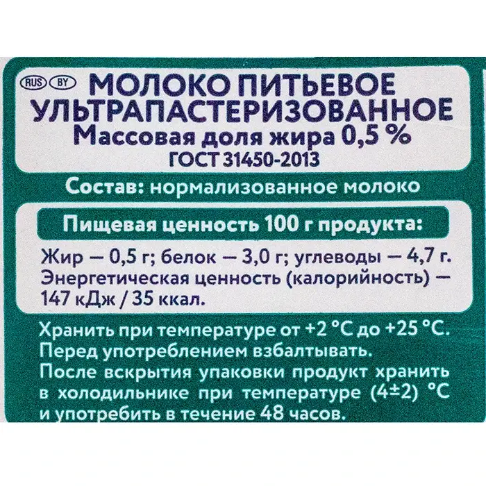 Молоко с жирностью 0,5% имеет натуральный сливочный вкус и легкую консистенцию. Продукт не содержит примесей и добавок.
