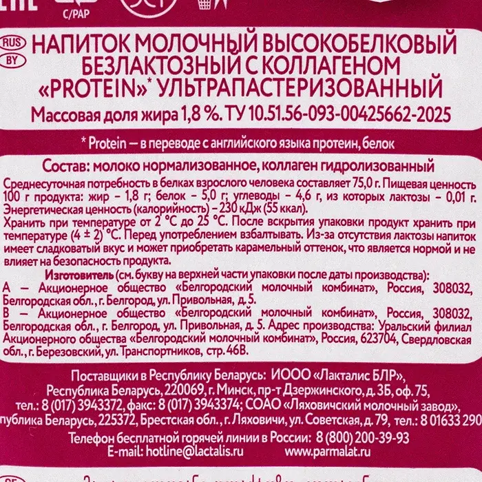 Молоко 1,8% безлактозное с коллагеном Parmalat Protein, 1 л