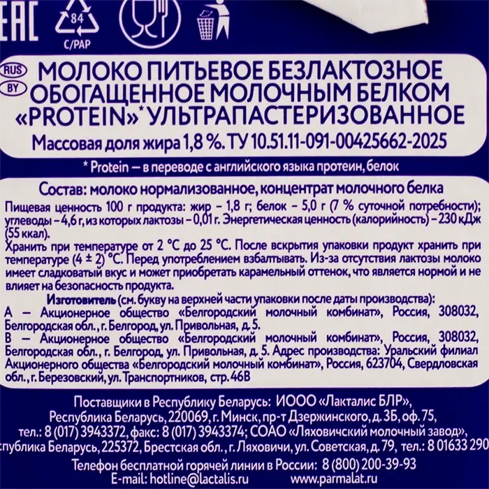 Молоко имеет жидкую консистенцию, повышенную питательную ценность благодаря добавлению сывороточного протеина, не содержит лактозу (молочный сахар), легко усваивается. Сохраняет все полезные компоненты обычного молока.
