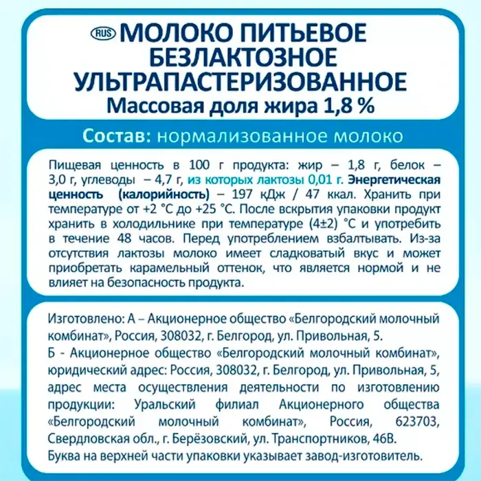 Молоко имеет жидкую консистенцию, не содержит лактозу (молочный сахар), легко усваивается. Сохраняет все полезные компоненты обычного молока.