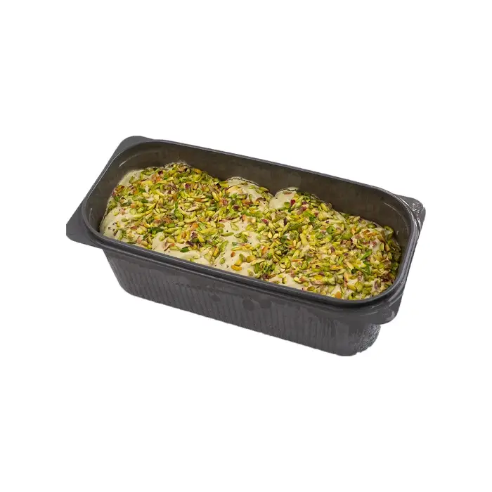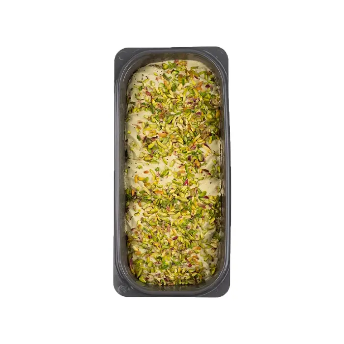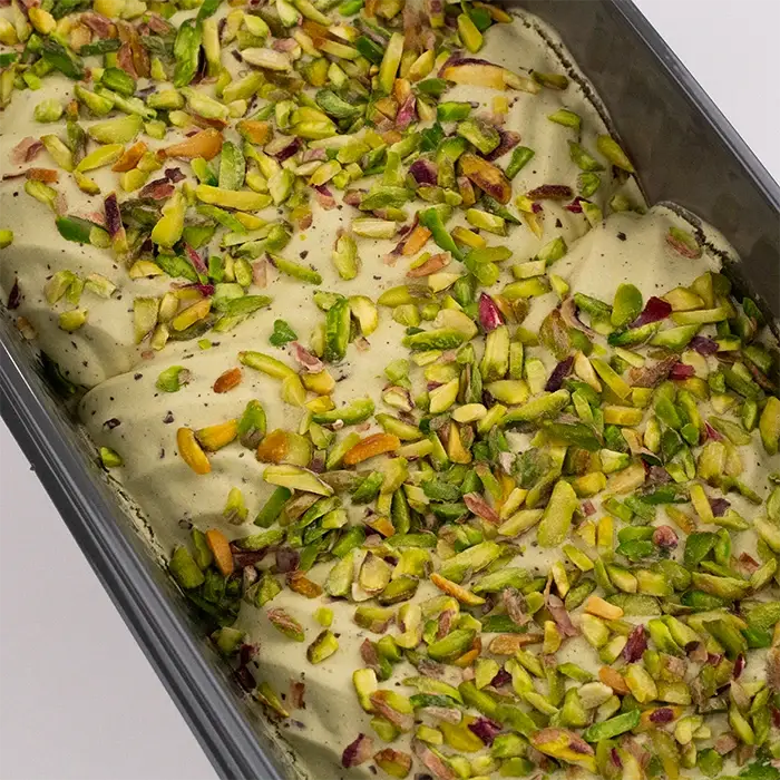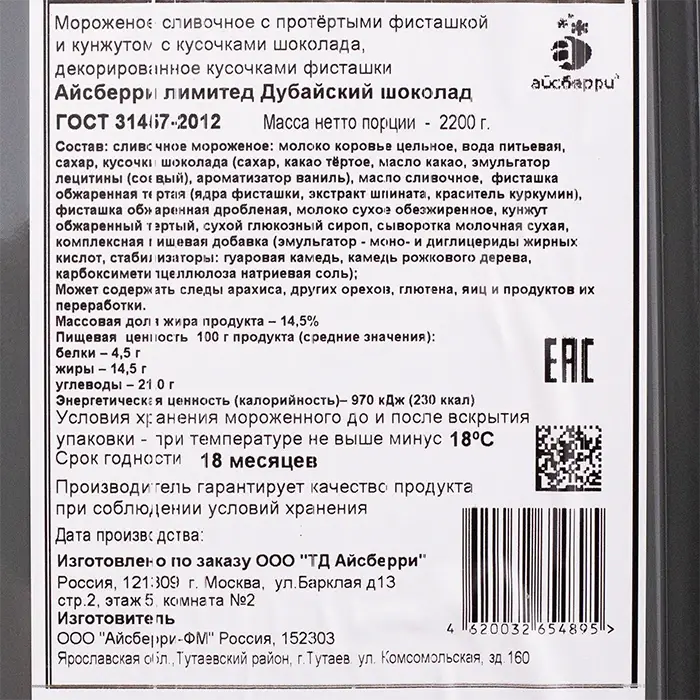 Мороженое Дубайский шоколад обладает мягкой кремовой и однородной текстурой с кусочками шоколада, насыщенным фисташковым вкусом с терпкими нотами шоколада. Мороженое посыпано дроблёными фисташками.