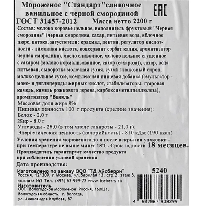 Мороженое смородиновое Стандарт «Айсберри», 2,2 кг
