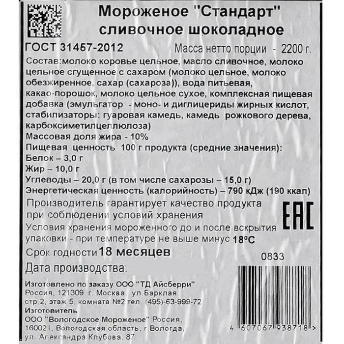 Мороженое шоколадное Стандарт «Айсберри», 2,2 кг