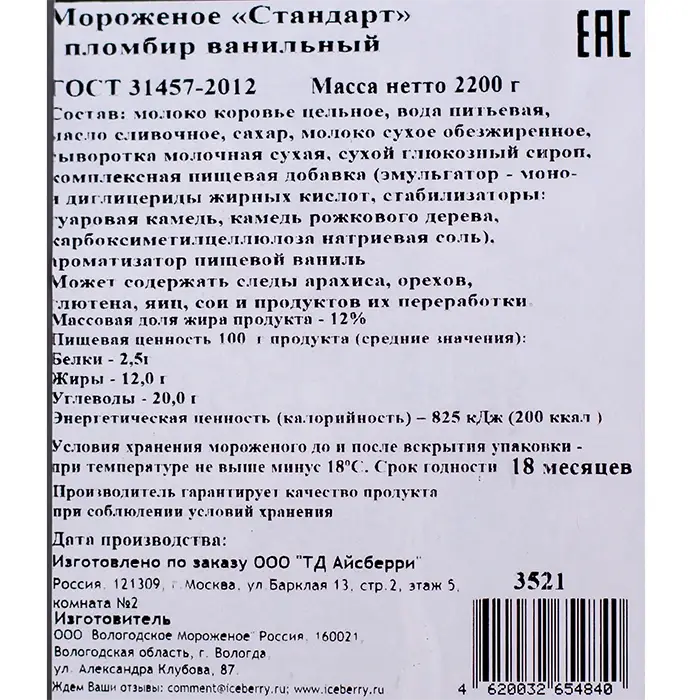 Мороженое Стандарт жир. 12% ванильный пломбир "Айсберри" 2,2 кг