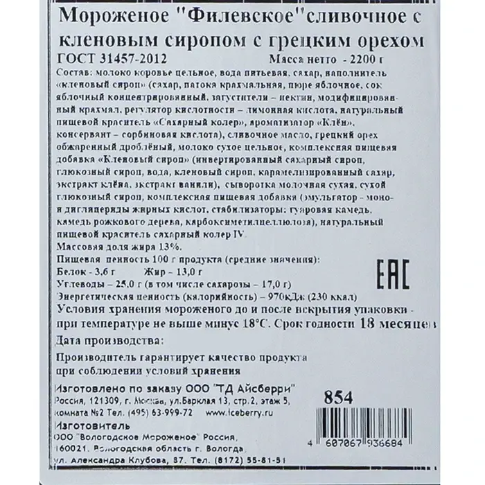 Мороженое сливочное с кленовым сиропом и грецким орехом «Филевское», 2,2 кг