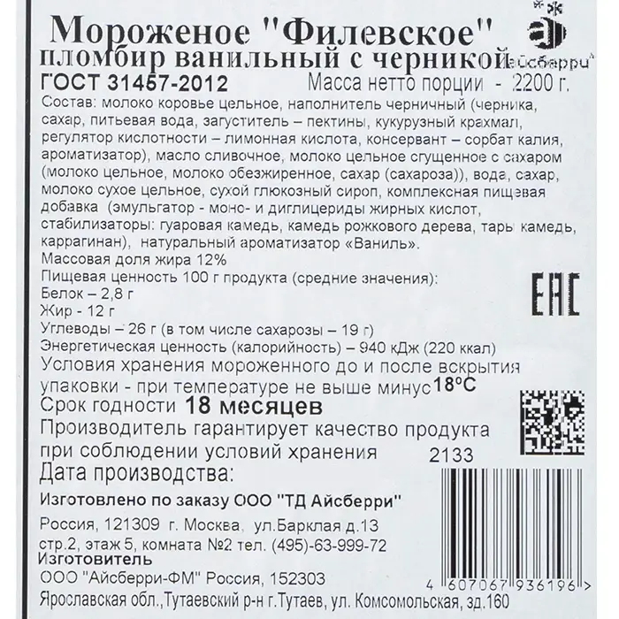 Пломбир — классический мороженый десерт с характерной нежной кремовой текстурой и насыщенным вкусом. Мороженое жирностью 12% имеет яркий черничный вкус и насыщенный сливочный аромат.