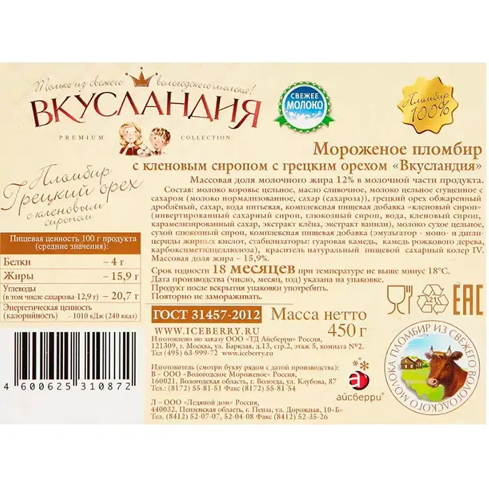 Пломбир с кленовым сиропом и грецким орехом «Вкусландия», 450 г