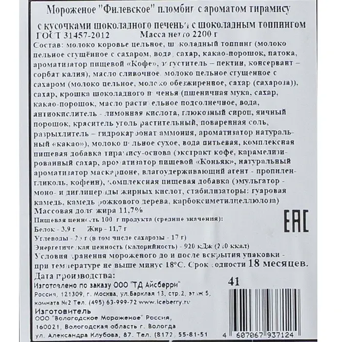 Молоко коровье цельное, шоколадный топпинг (молоко цельное сгущеное с сахаром, вода, сахар, какао-порошок, патока, ароматизатор пищевой «Кофе», загуститель — пектин, консервант — сорбат калия), масло сливочное, молоко цельное сгущеное с сахаром (молоко цельное, молоко обезжиренное, сахар (сахароза)), сахар, крошка шоколадного печенья (пшеничная мука, сахар, какао-порошок, масло растительное подсолнечное, вода, антиокислитель — лимонная кислота, глюкозный сироп, яичный порошок, краситель — уголь растительный, поваренная соль, разрыхлитель — гидрокарбонат аммония, ароматизатор натуральный «какао»), молоко цельное сухое, вода питьевая, комплексная пищевая добавка тирамису-основа (экстракт кофе, карамелизированный сахар, ароматизатор пищевой «Коньяк», натуральный ароматизатор маскарпоне, влагоудерживающий агент — пропилен-гликоль, кофеин), комплексная пищевая добавка (эмульгатор — моно- и диглицериды жирных кислот, стабилизаторы: гуаровая камедь, камедь рожкового дерева, карбоксиметилцеллюлоза).