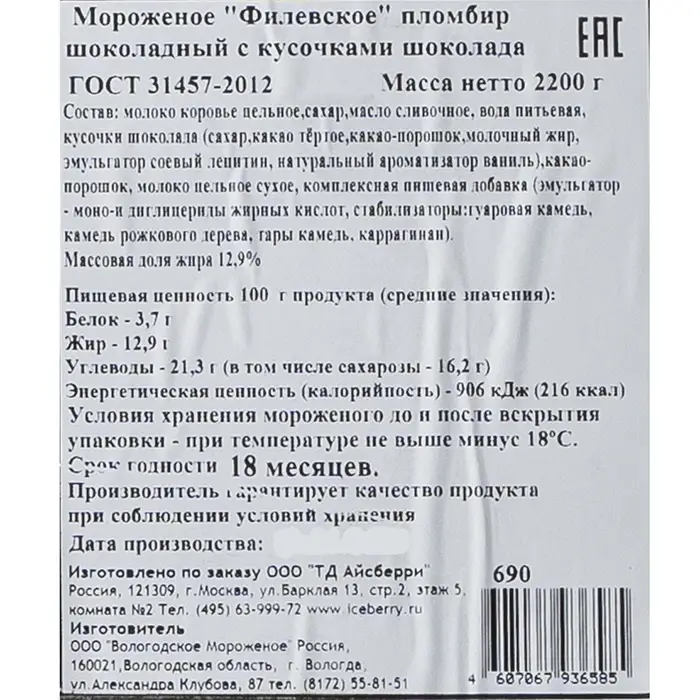Шоколадный пломбир с кусочками шоколада «Филевское», 2,2 кг