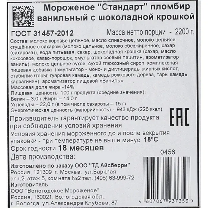 Молоко коровье цельное, масло сливочное, молоко цельное сгущеное с сахаром (молоко цельное, молоко обезжиренное, сахар (сахароза)), вода питьевая, сахар, шоколадная крошка (сахар, масло кокосовое, какао-порошок, эмульгатор соевый лецитин, ароматизатор ваниль), молоко цельное сухое, сухой глюкозный сироп, комплексная пищевая добавка (эмульгатор — моно- и диглицериды жирных кислот, стабилизаторы: гуаровая камедь, камедь рожкового дерева, тары камедь, каррагинан), натуральный ароматизатор «Ваниль».