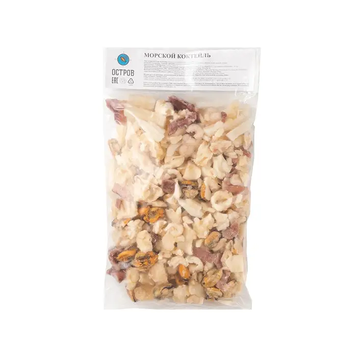 Полоски кальмара тихоокеанского 35%, щупальца кальмара тихоокеанского 30%, вареное мясо мидий 20%, осьминог обыкновенный резаный 10%, креветка тепловодная 5%.