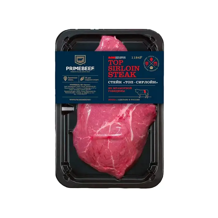 Топ Сирлойн — стейк из верхней части тазобедренного отруба, не содержит костей и излишнего жира, имеет мягкую упругую текстуру, выраженную мраморность, насыщенный говяжий вкус со сладковатыми нотами и аромат. Постное и нежное мясо в готовом виде получается мягким и сочным, с глубоким и богатым послевкусием.
