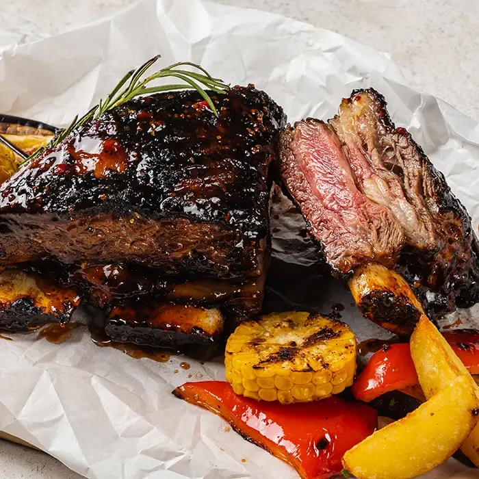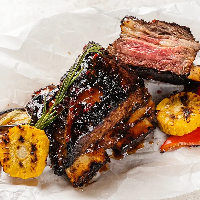 Ребра Кальби — мраморное мясо с реберной части бычка, прилегающей к лопатке. Особенность Кальби в том, что мясо располагается не только между косточек, но и поверх них. Ребра имеют высокую мраморность, сочную упругую текстуру, яркий говяжий вкус и насыщенный аромат.