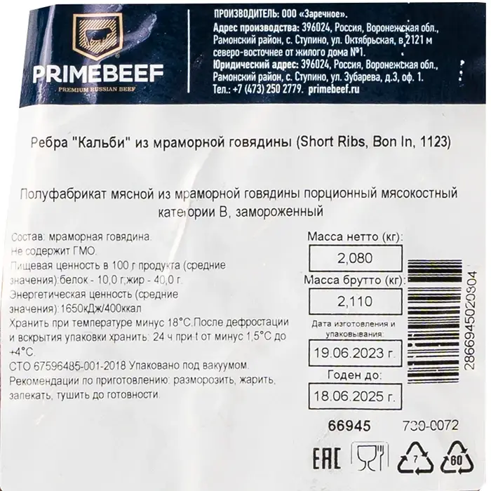 Мраморная говядина, ребра резаные Кальби «Праймбиф», 1–1,3 кг