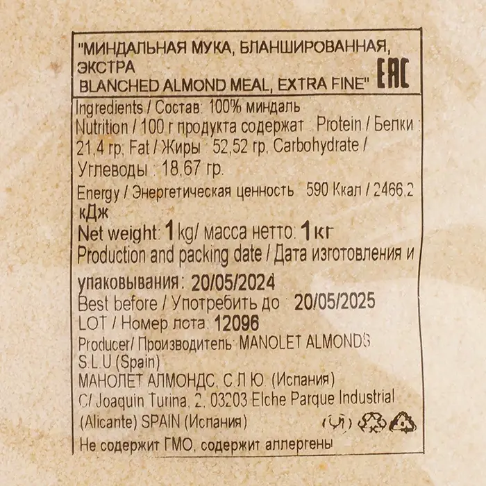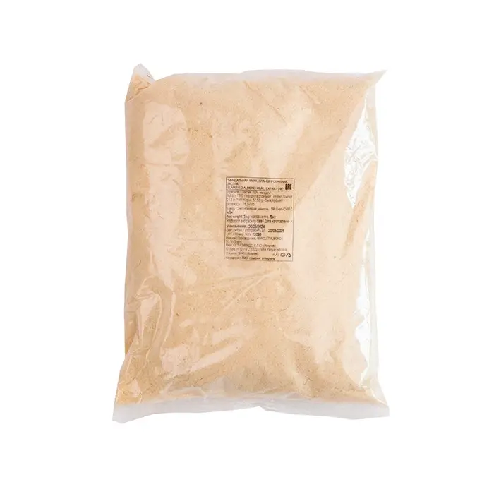 Мелко помолотый миндаль с тонким ореховым вкусом и нежным ароматом. Мука придает выпечке влажность и нежность, не дает тесту пересушиваться в духовке.