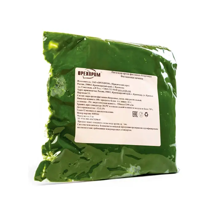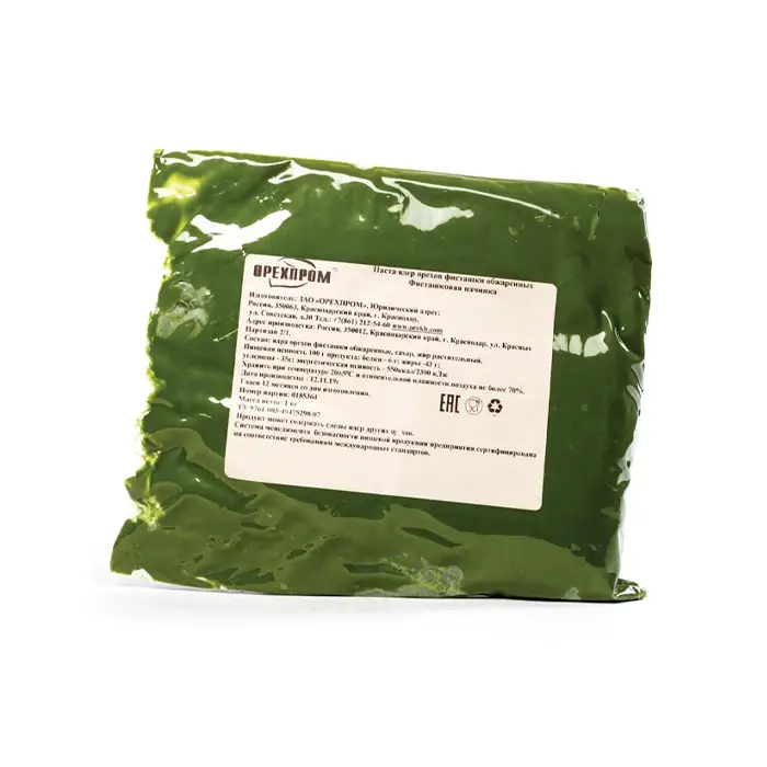 Фисташковая паста с нежным кремовым вкусом с яркими ореховыми нотами, густой текстурой и насыщенным цветом.
