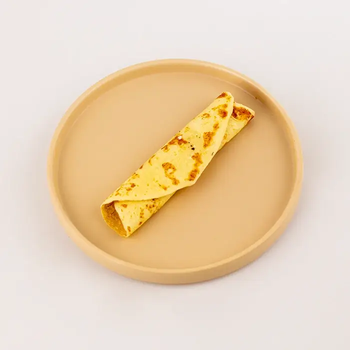 Рулет из нежного омлета с начинкой из сыра и грибов. Внешний слой рулета — равномерный, слегка пористый, желтого цвета пласт, сбоку видна начинка из мелконарезанных грибов и тягучего сыра. Рулет имеет сливочно-солоноватый вкус с легкими пикантными нотами, нежную текстуру и молочно-яичный аромат.