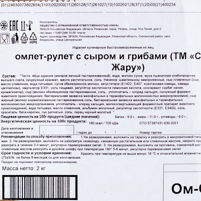 Тесто: яйцо куриное (меланж яичный пастеризованный), вода, молоко сухое, мука пшеничная хлебопекарная высшего сорта, кукурузный крахмал, масло растительное, соль. Начинка: шампиньоны замороженные, сыр плавленый (сыр, масло сливочное, вода питьевая, сухое обезжиренное молоко, загустители (Е1422, Е407, ксантановая камедь, камедь целлюлозы), эмульгатор Е331, соль пищевая, регулятор кислотности лимонная кислота, консервант сорбат калия, кроматизатор), сыр (молоко обезжиренное пастеризованное, соль, уплотнитель – хлорид кальция, сычужный фермент животного происхождения, бактериальная закваска мезофильных и термофильных молочнокислых микроорганизмов), сыр жирный (молоко нормализованное пастеризованное,соль, бактериальная закваска мезофильных и термофильных молочнокислых микроорганизмов, уплотнитель - хлорид кальция, молокосвертывающий ферментный препарат животного происхождения), вода питьевая, масло сливочное, альбумин молочный, регулятор кислотности (Е331, Е340ii), соль, краситель: бета-каротин, лук репчатый, соль, перец черный молотый.