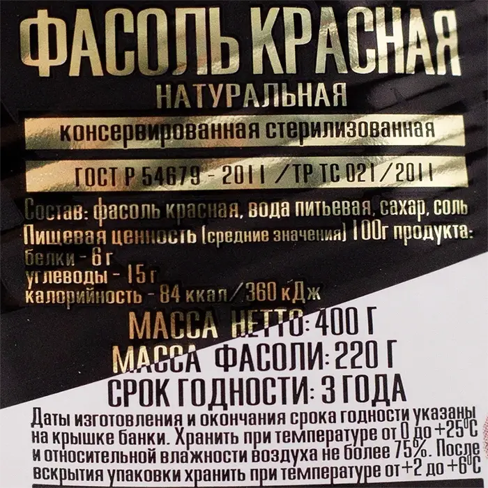 Отборные зерна фасоли имеют овальную форму, красный цвет, упругую нежную текстуру, бобовый вкус со сладковатыми нотами. Сбалансированное добавление соли и сахара подчеркивает натуральный вкус продукта, не делает его резким или приторным.