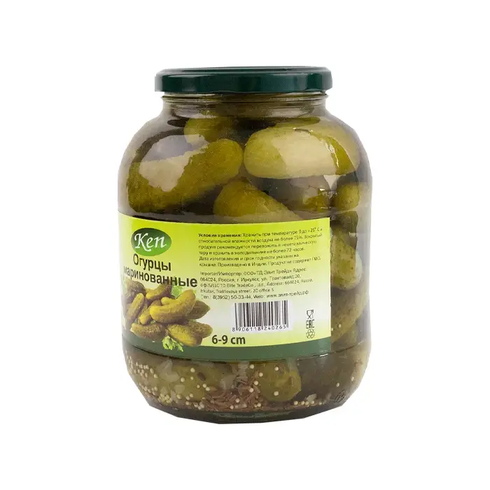 Продукт изготовлен из свежих огурцов длиной 6-9 см, благодаря чему они идеально подходят для закусок, салатов и бутербродов.