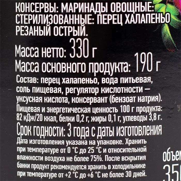 Халапеньо, вода, соль, уксусная кислота, отвердитель хлорид кальция.