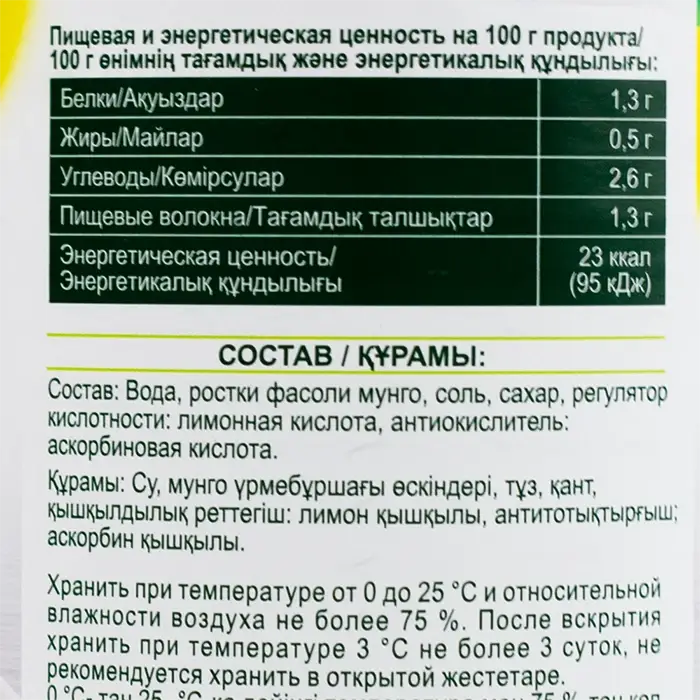 Ростки фасоли мунго, вода, соль, сахар, регулятор кислотности: лимонная кислота, антиокислитель: аскорбиновая кислота.