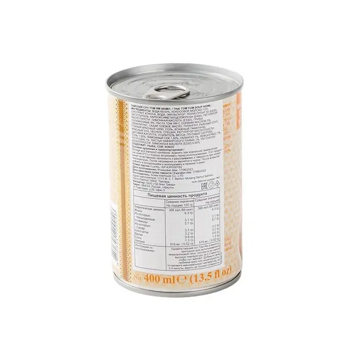 Вода 69.5%, кокосовое молоко 10%, соломенные грибы 8%, паста Том Юм (лук, чеснок тамаринд, креветочная паста) с соевым маслом 5% соль 1.5%, лимонный сок 1.5%, трава лимонника1%, имбирь 1%, петрушка 1%, листья лайма 1%, регулятор кислотности – лимонная кислота (е 330) 0,5%.