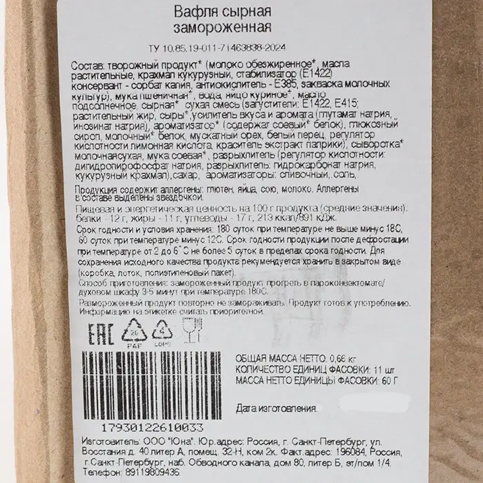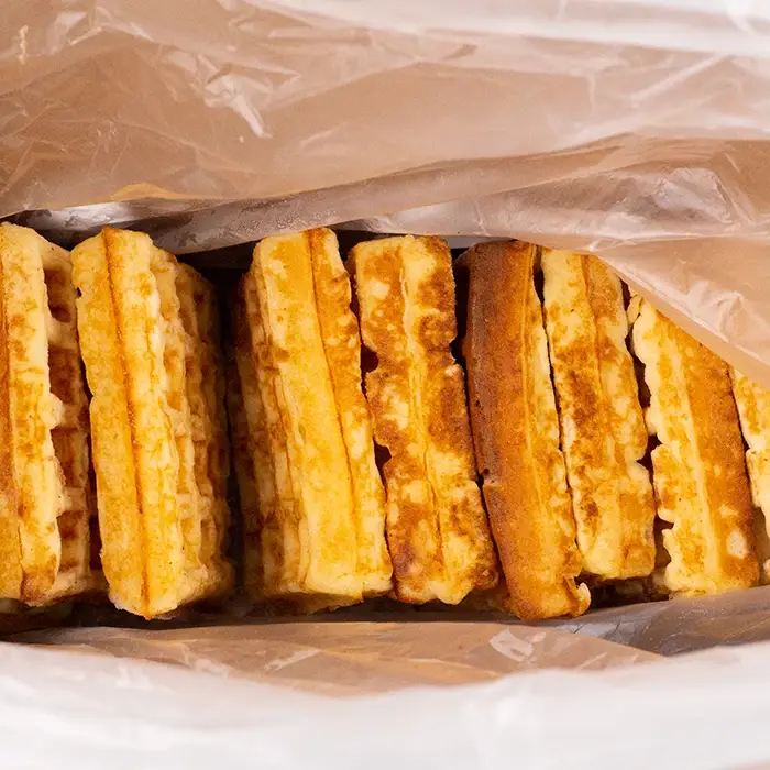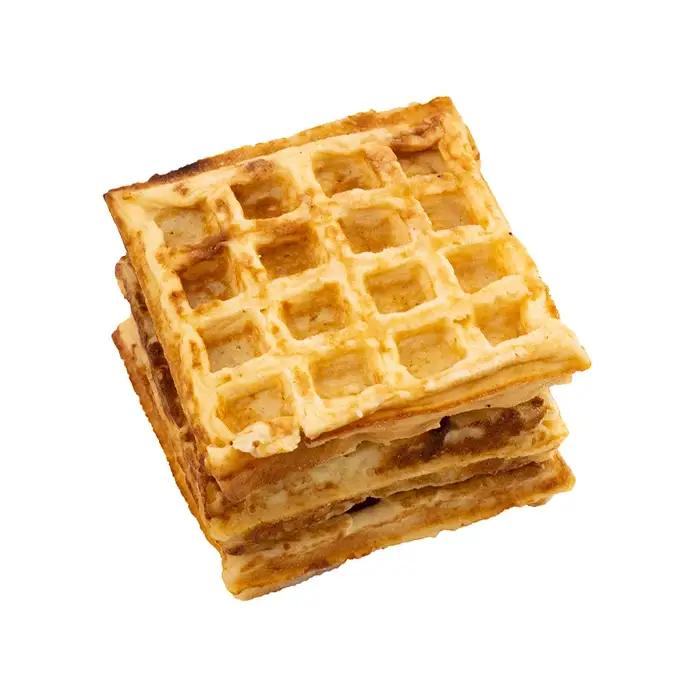 Мягкие, квадратные вафли с сырным вкусом готовы к употреблению, сохраняют форму и свойства при разморозке.