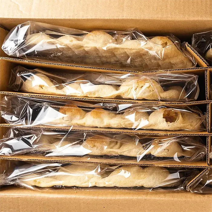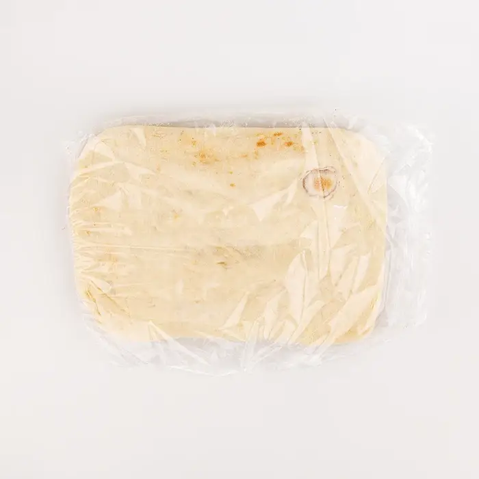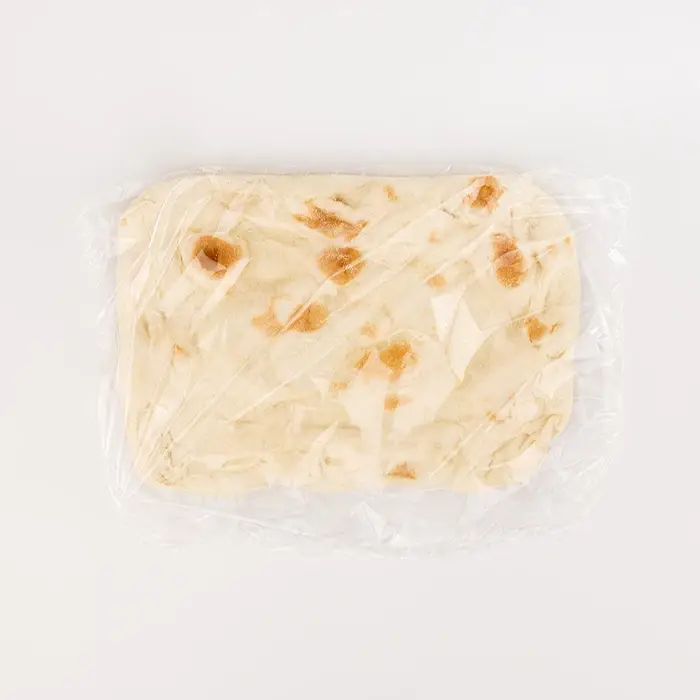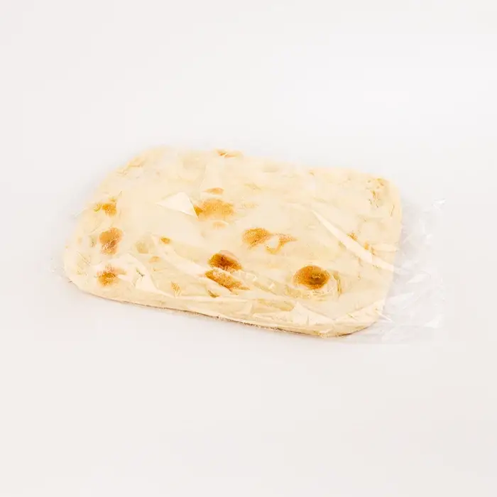 Основа для пиццы изготовлена из теста и предварительно выпечена, имеет прямоугольную форму, воздушные края с легкой пористостью и плотным дном, нейтральный вкус с легкими хлебными и сливочными нотами и аромат свежей выпечки.