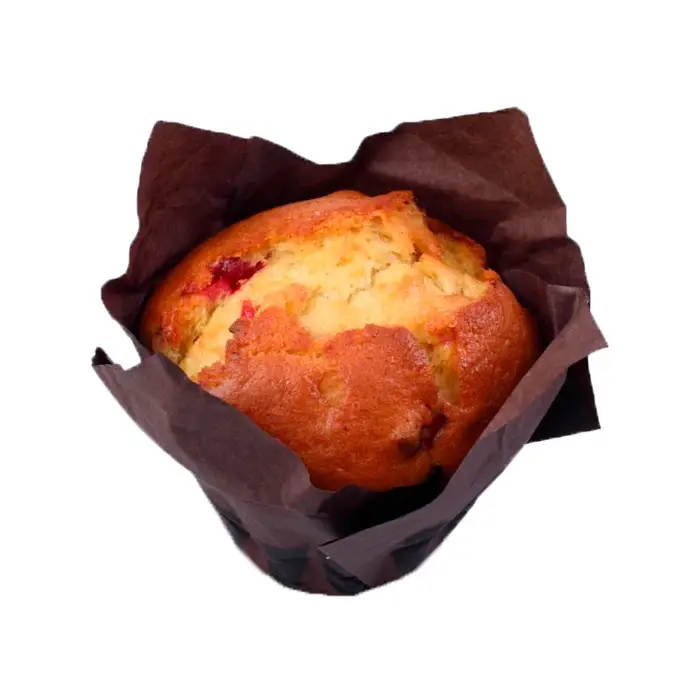 "Мука пшеничная высшего сорта, сахар, масло подсолнечное рафинированное дезодорированное, меланж яичный жидкий, смесь для маффинов (мука пшеничная, крахмал пшеничный, разрыхлители (Е500ii, Е450i, Е341i), сыворотка молочная сухая, соль, загуститель (Е415), ароматизатор, краситель (Е160а(i)), ферменты), брусника быстрозамороженная, вода питьевая"