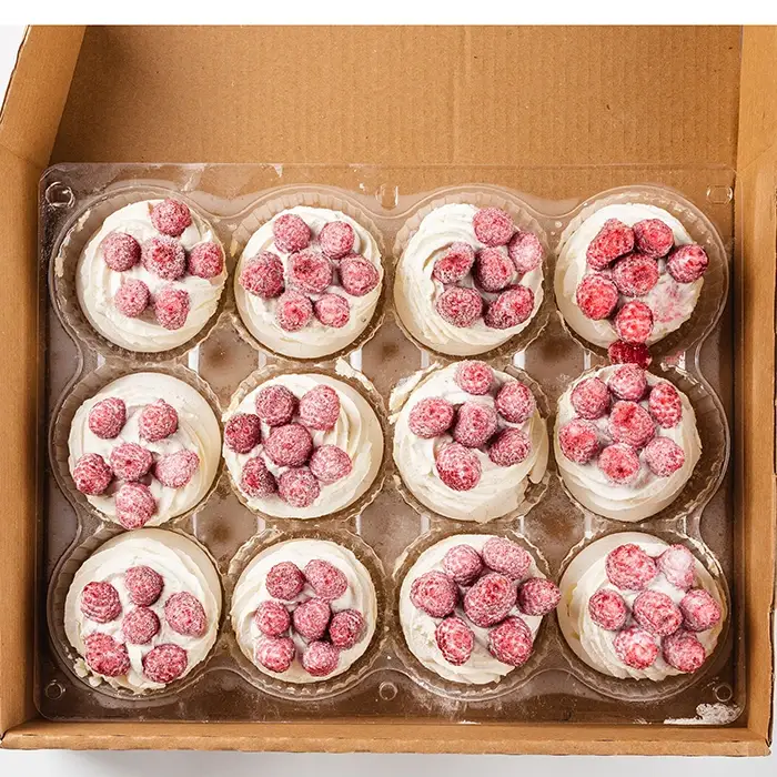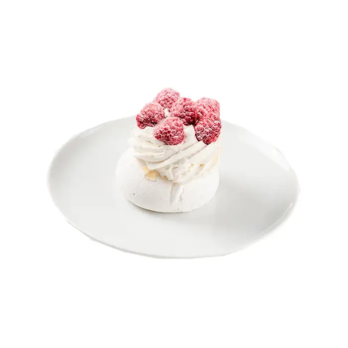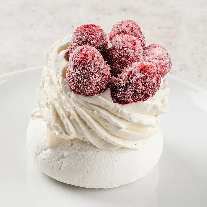 Популярное воздушное пирожное из нежной меренги, сливочного крема и с сердцевиной из вишневого конфитюра. Сверху десерт украшен свежими ягодами малины.