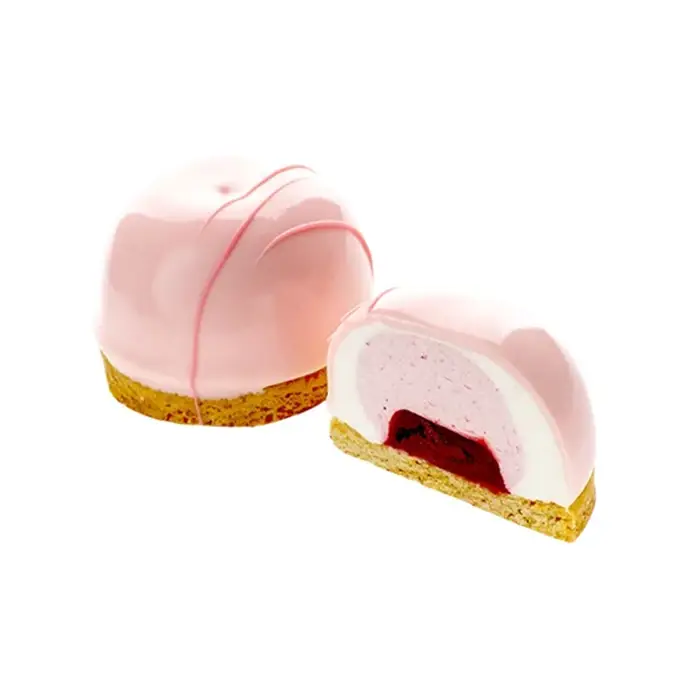 Очень нежные и красивые пирожные для семейного чаепития и праздничного стола. На хрустящей песочной основе два мусса: ароматный малиновый и нежный ванильный, внутри которых капсула из малинового конфитюра. В упаковке 12 пирожных.