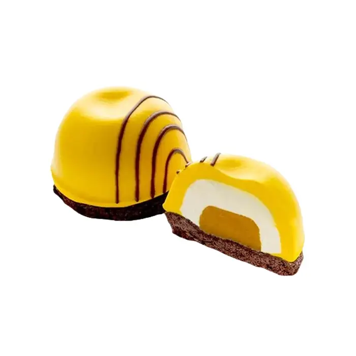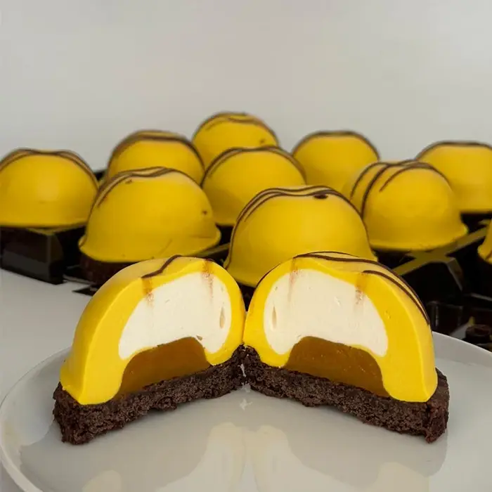 Пирожное на хрустящей песочной основе с сочным пюре манго, слоем ванильного мусса и ароматным муссом из манго и маракуйи.