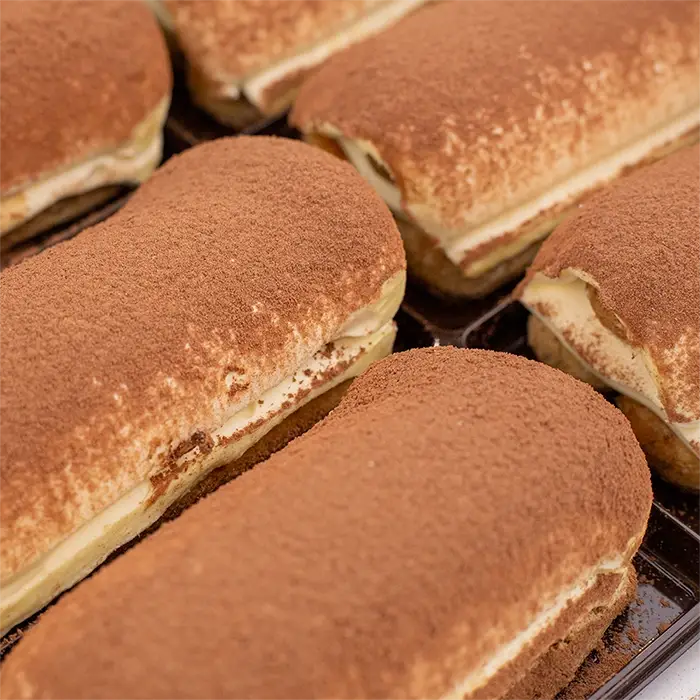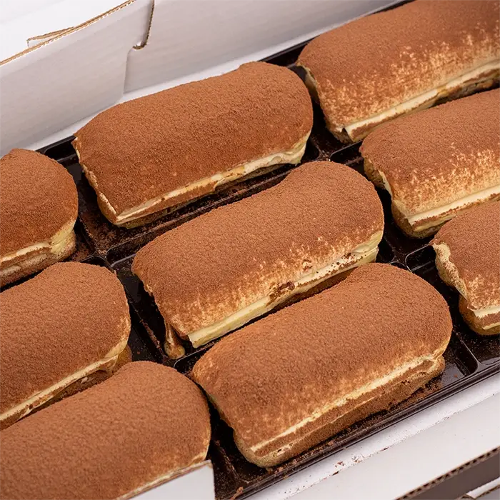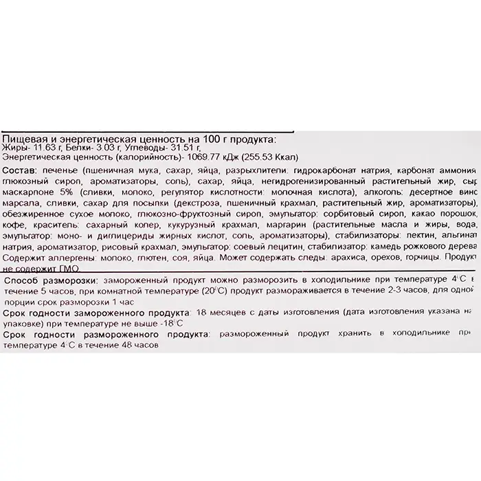 Печенье (пшеничная мука, сахар, яйца, разрыхлители: гидрокарбонат натрия, карбонат аммония; глюкозный сироп, ароматизаторы, соль), сахар, яйца, негидрогенизированный растительный жир, сыр маскарпоне 5% (сливки, молоко, регулятор кислотности: молочная кислота), алкоголь (1%): вино Марсала; сливки, сахар для посыпки (декстроза, пшеничный крахмал, растительный жир, ароматизаторы), обезжиренное сухое молоко, глюкозно-фруктозный сироп, эмульгатор: сорбитовый сироп; какао порошок, кофе, краситель: сахарный колер; кукурузный крахмал, маргарин (растительные масла и жиры, вода, эмульгатор: моно- и диглицериды жирных кислот; соль, ароматизаторы), стабилизаторы: пектин, альгинат натрия; ароматизатор, рисовый крахмал, эмульгатор: соевый лецитин; стабилизатор: камедь рожкового дерева.