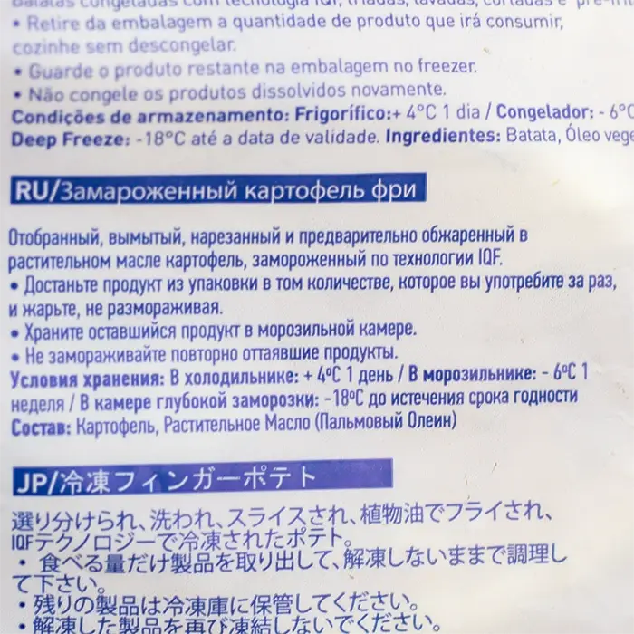 Картофель фри имеет хрустящую сочную текстуру, натуральный вкус отборного картофеля, который очищен и нарезан на ровные бруски размером 7х7 мм. При жарке образуют золотистую корочку.