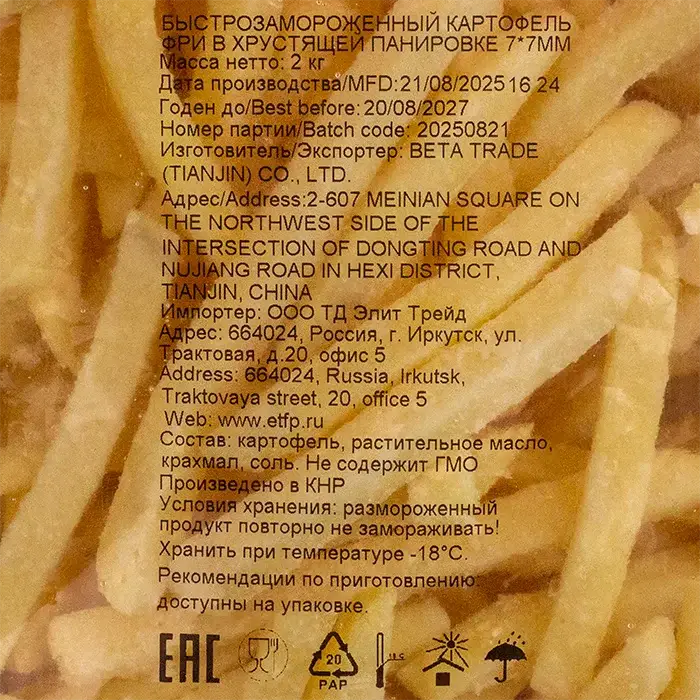 Картофель фри 7х7 мм в хрустящей панировке "Beta Trade", 2 кг