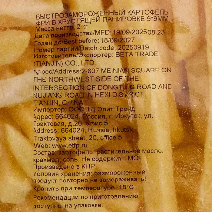 Картофель фри 9х9 мм в хрустящей панировке "Beta Trade", 2 кг