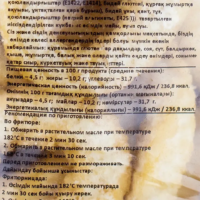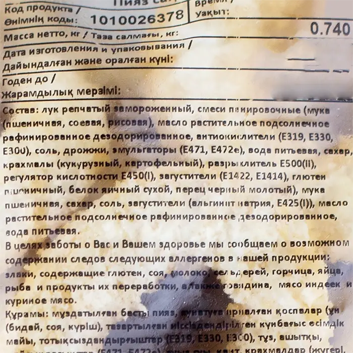 Лук репчатый замороженный, сухари панировочные [мука пшеничная, соль, масло растительное подсолнечное рафинированное дезодорированное, дрожжи, сахар, вода питьевая, эмульгаторы (Е471, Е472е), антиокислитель Е300], масло растительное подсолнечное рафинированное дезодорированное (содержит антиокислитель Е306), вода питьевая, мука (пшеничная, из твердых сортов пшеницы, рисовая), крахмал кукурузный, соль, сахар, загустители (Е401, Е425(i)), разрыхлители (E450(i), E500(ii)), стабилизатор Е1420, глютен пшеничный, белок яичный сухой, перец черный молотый.