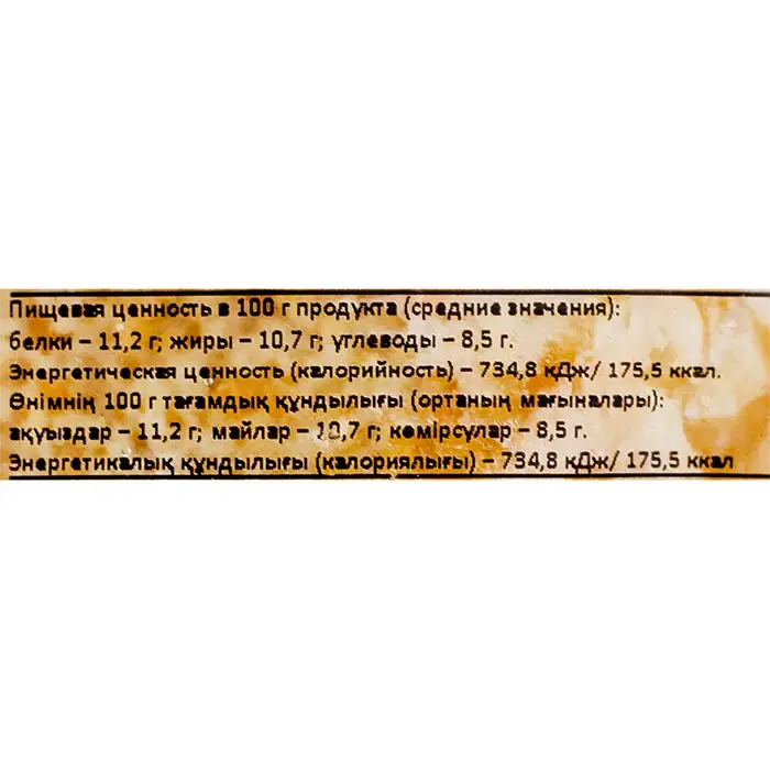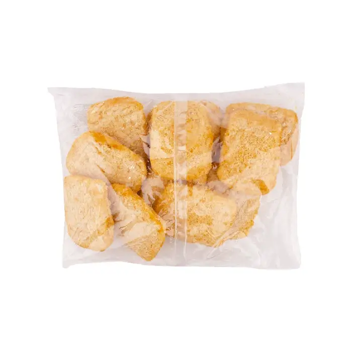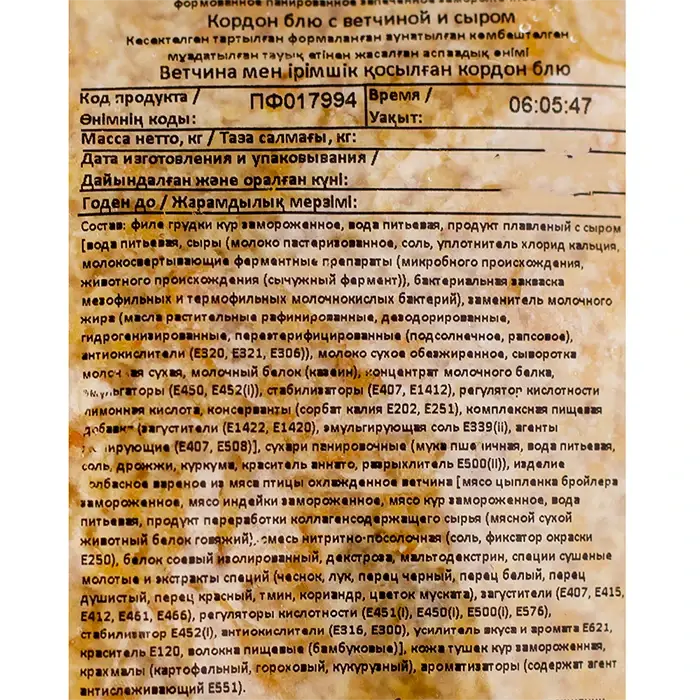 Филе грудки кур замороженное, вода питьевая, мука пшеничная, продукт плавленый с сыром [вода питьевая, заменитель молочного жира (рафинированные дезодорированные растительные масла в модифицированном переэтерифицированном виде (подсолнечное, рапсовое)) антиокислитель Е306), сыр полутвердый (молоко пастеризованное, молокосвертывающий ферментный препарат животного происхождения (сычужный фермент), уплотнитель Е509, консервант E251, мезофильные молочные культуры), концентрат молочного белка, комплексная пищевая добавка (загустители (Е1422, Е1420), эмульгатор Е452(i), эмульгирующая соль Е339(ii), агенты желирующие (Е407, Е508), фруктоза, сыворотка молочная сухая, соль поваренная пищевая, ароматизаторы пищевые, консервант сорбат калия Е202], изделие колбасное ветчинное из мяса птицы ветчина [мясо кур замороженное, вода питьевая, нитритно- посолочная смесь (соль, фиксатор окраски нитрит натрия), крахмал картофельный, специи молотые и экстракты специй (чеснок, перец черный, перец белый, перец душистый, тмин, кориандр, мускат), регуляторы кислотности (Е450(i), Е451(i)), загустители (ксантановая камедь, гуаровая камедь), волокна пищевые (бамбуковые), продукт переработки коллагенсодержащего сырья (белок животный говяжий сухой), агент желирующий хлорид калия, усилитель вкуса и аромата Е621, ароматизатор, краситель кармины], масло растительное подсолнечное рафинированное дезодорированное, кожа тушек кур замороженная, соль, крахмал (картофельный, гороховый), белок соевый, волокна пищевые (клетчатка пшеничная), регуляторы кислотности (Е500(i), глюконат натрия), дрожжи, антиокислитель аскорбиновая кислота, загустители (метилцеллюлоза, Е466, Е1422, гуаровая камедь) куркума, краситель экстракт паприки, ароматизаторы.