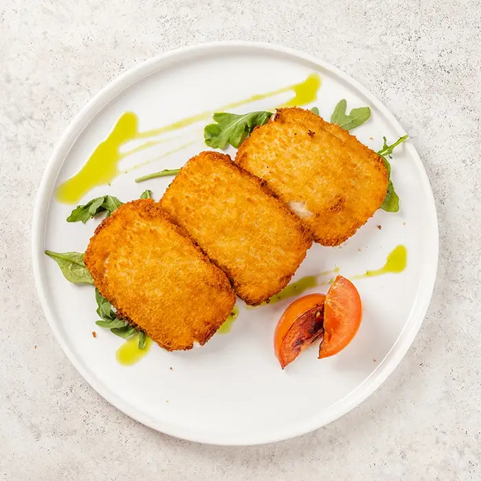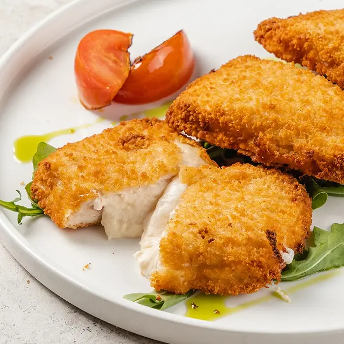 Готовые котлеты приготовлены из нежного филе цыпленка с добавлением начинки из ветчины и сыра. Пикантные специи делают вкус насыщенным, а золотистая корочка сохраняет сочность начинки.
