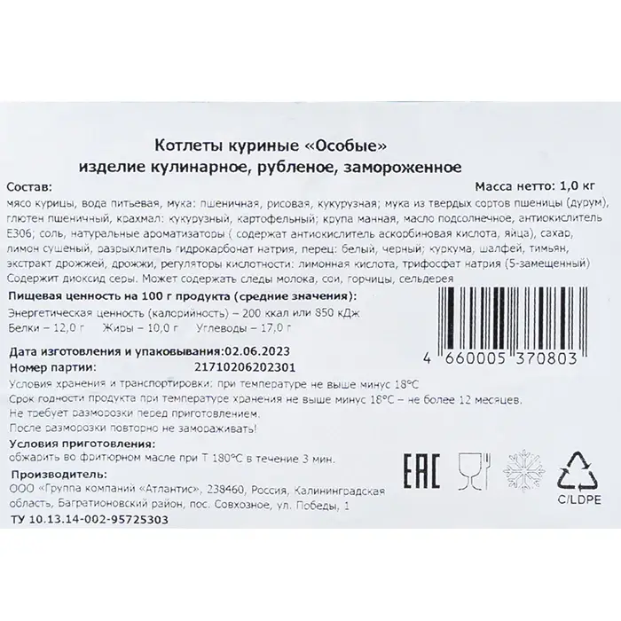 Котлеты куриные Особые в панировке «ТК Атлантис», 1 кг