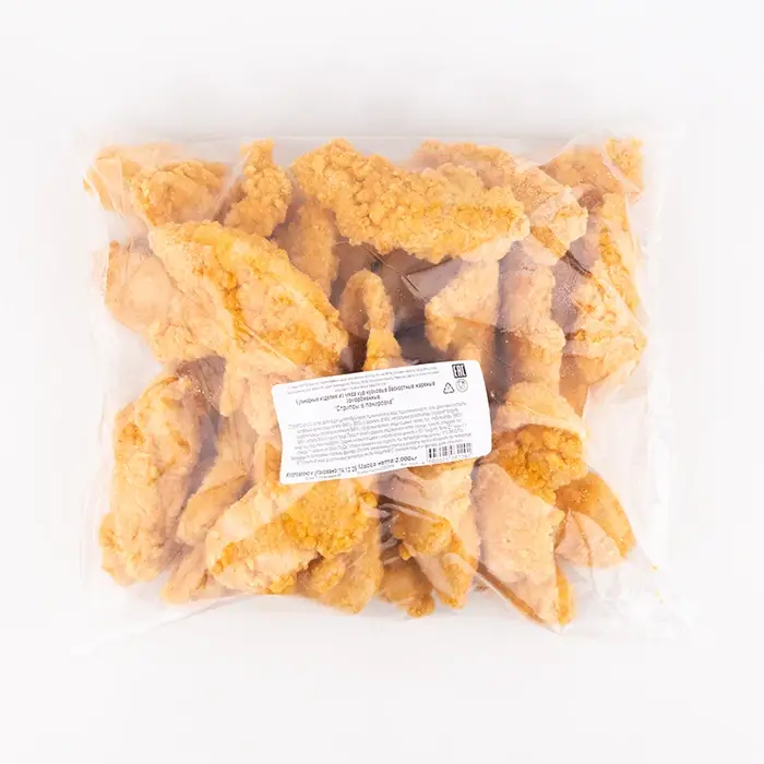 Аппетитные тонкие полоски из куриного мяса в хрустящей панировке. Их можно подавать как самостоятельную закуску, основное блюдо или использовать в составе блюд.
