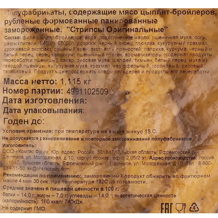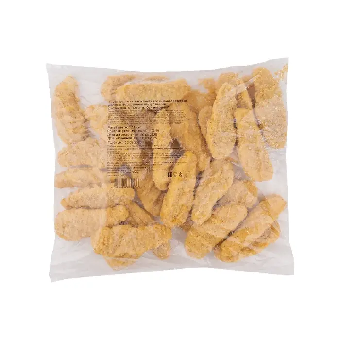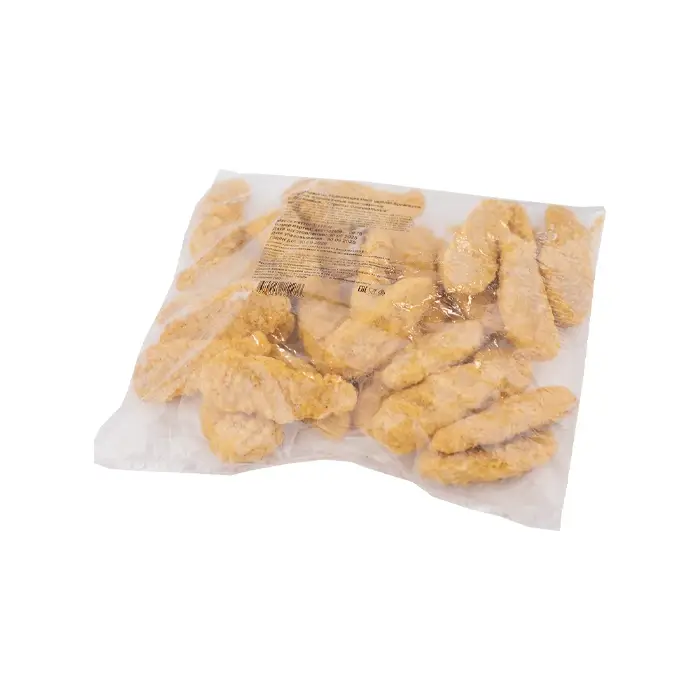 Мясо куриное Халяль(50%), вода, мука (пшеничная, кукурузная, рисовая),сухари панировочные (мука пшеничная, крахмал пшеничный, масло рапсовое, глютен пшеничный, соль, дрожжи, антиокислитель Е392), масло растительное (подсолнечное), крупа манная, глютен пшеничный, соль, крахмал (картофельный, гороховый, рисовый, пшеничный, кукурузный, тапиоки), порошок (луковый, томатный, чесночный), специи (черный перец, кориандр, кумин), ароматизатор,экстракт дрожжевой, разрыхлители (Е450(i), Е500(ii)), сахар, травы.