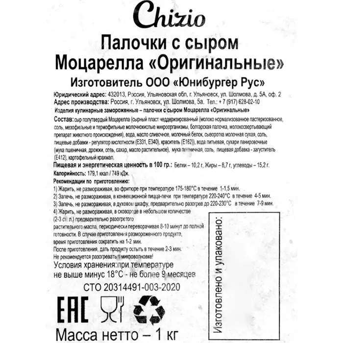Сыр полутвердый Моцарелла (сырный плсат чеддеризированный (молоко нормализованное пастеризованное, соль, мезофильные и термофильные молочнокислые организмы, болгарская паслочка, молокосвертывающий препарат животного происхождения), вода, масло сливочное, молочный белок, сыворотка молочная сухая, соль, пищевые добавки — регулятор кислотности (Е331, Е340), краситель (Е162)), вода питьевая, сухари панировочные (мука пшеничная, дрожжи, соль, сахар, масло растительное), мука пшеничная, соль, пищевая добавка — загуститель (Е412), картофельный крахмал.
